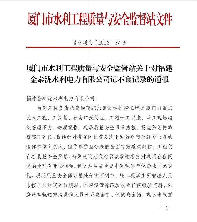 厦门市水利工程质量与安全监督站关于对福建金泰泷水利电力有限公司记不良记录的通报